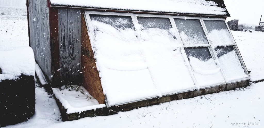 Just a few days after we moved our plants into their new home, our “cold frame” truly earned its name. While snow covered the outside of the panes, our tender seedlings inside stayed protected .