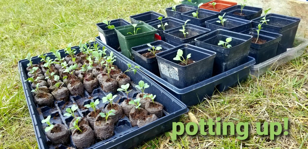 As plants tend to do, they were soon outgrowing the seed starting trays and needed to be potted up. Our neighbors had generously gifted us with several dozen used 3″ and 4″ pots, which I cleaned up and put right to work. Our first round of seedlings included cabbage, broccoli, purple broccoli, cauliflower, kale, and a plethora of flowers ranging from poppies to echinacea to phlox. I had planted carrots in a large flower pot that stayed in the cold frame as well.