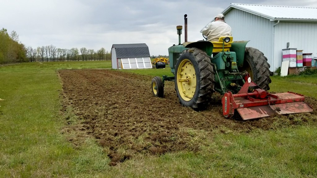 In early Spring, we made the decision to expand our garden to a new area. The garden plot we have used in the past is primarily heavy clay soil (like nearly all the soil in this area,) requiring much amending (this is where we planted our brassicas in part 2.) Following the snow melt and spring rains, this garden plot typically takes days and sometimes weeks for the water to soak into the soil or evaporate enough to keep young plants and seeds from drowning or rotting under the surface. A new location on slightly higher ground was chosen, not to be used as a replacement, but in addition to and adjoining the old garden plot. We live in “pancake land” as we call it, so higher ground might be a mere 6″ higher than the previous location. We were hopeful that this area would more easily shed water. As the tractor tiller struck into the earth, we discovered that we’d found a SAND VEIN! Who’d have thought it?! Sandy soil opened up a whole new world of planting possibilities for us, including root crops and potatoes that, if planted in the old garden, wouldn’t produce due to being overburdened and smothered by the dense clay.