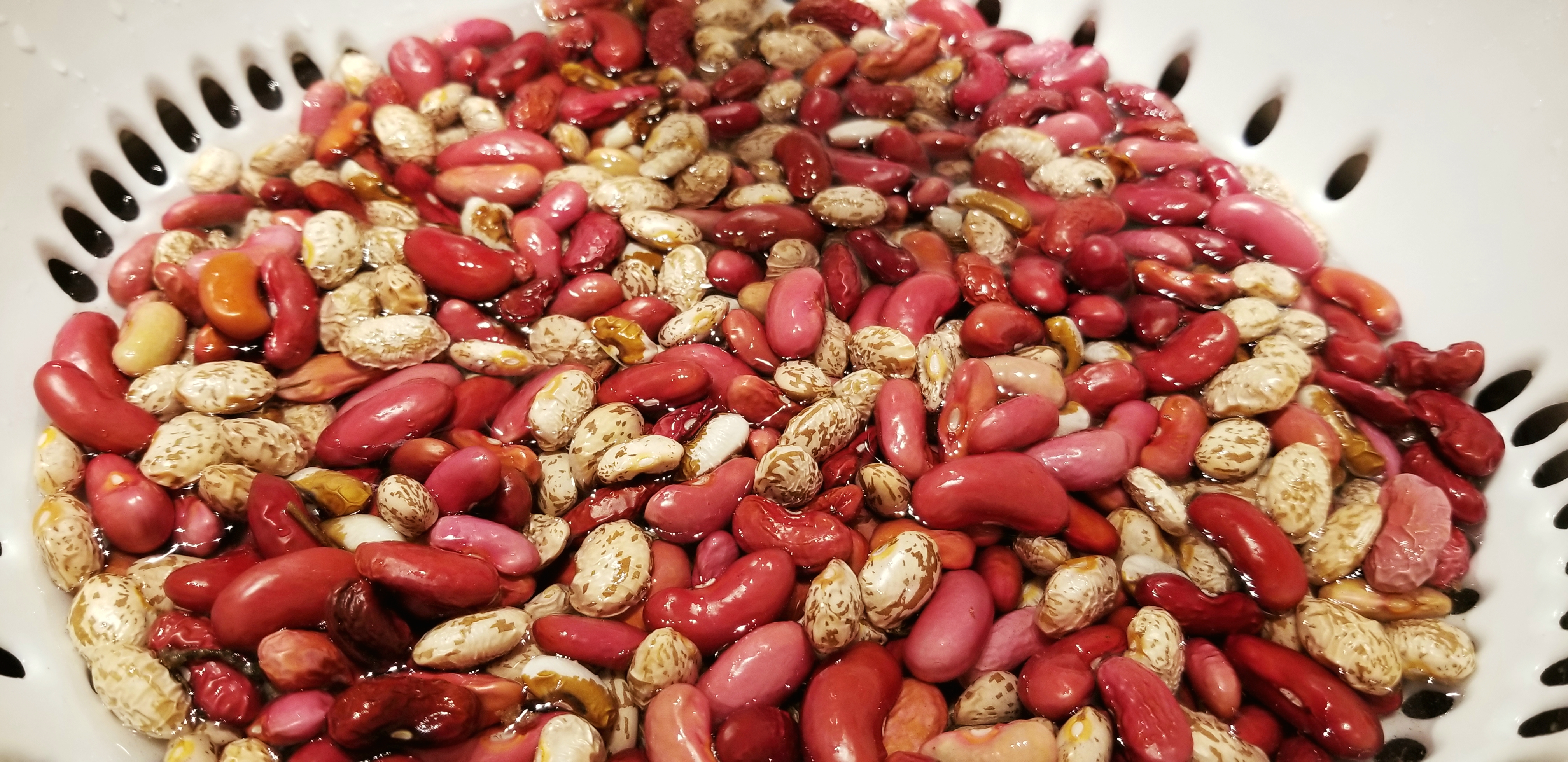Another experimental crop in 2020 was dried beans. We grew light and dark kidney beans, pintos, and painted pony beans. Once the seeds were sown, it really was as easy as watering, weeding, and waiting. When the pods were brown and dry enough that the seeds inside rattled when shaken, they were picked, shelled, and washed.